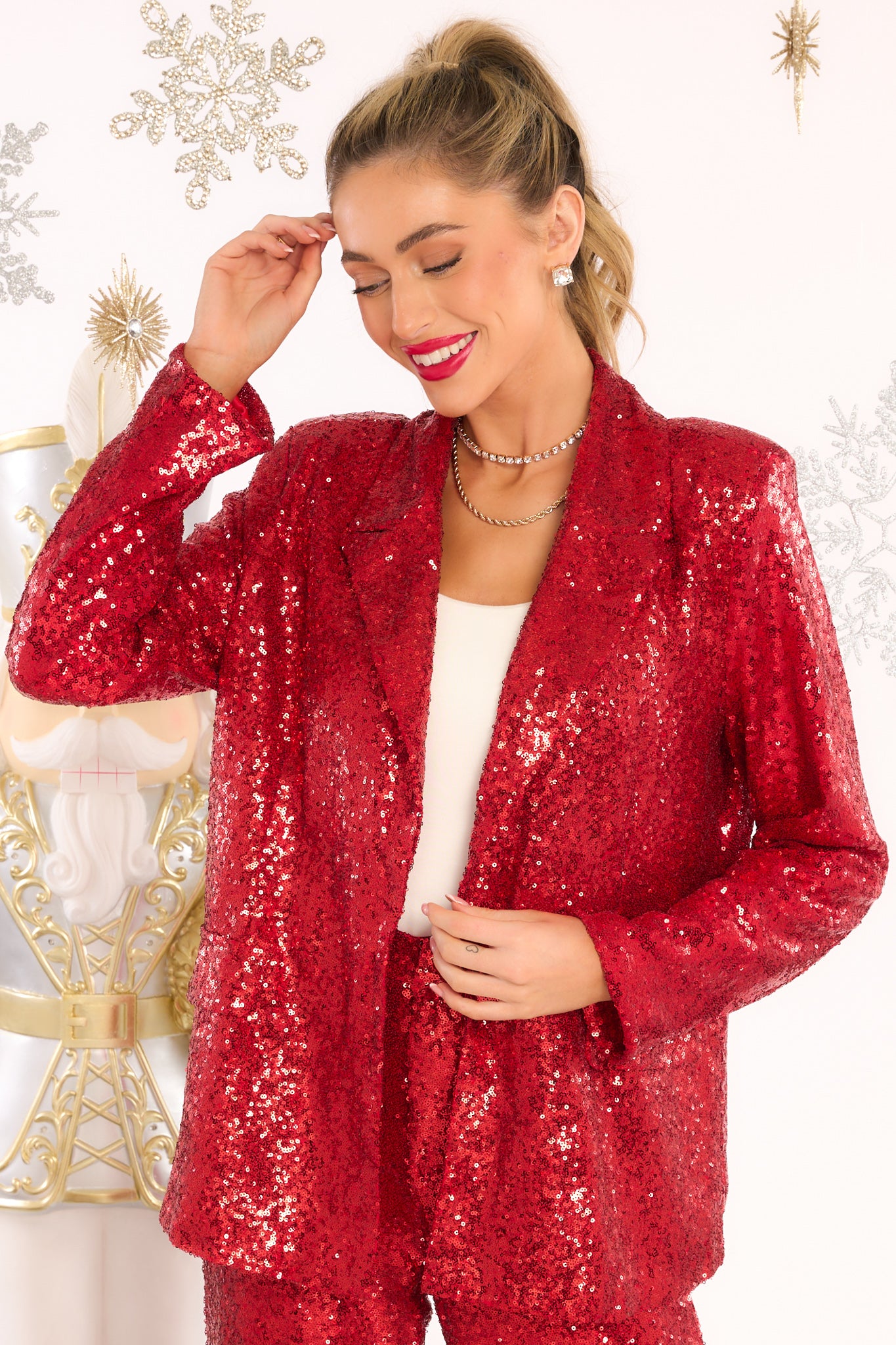 Look extra sharp in this Just Pretend Red Sequin Blazer! Featuring shimmery sequins and sleek lines, this blazer is made for making a statement. Show 'em you mean business without taking yourself too seriously! (But don't forget to sparkle!) This blazer features a double breasted collar, shoulder pads, faux pockets, and an all over sequin design. Model is wearing a size small. • 95% Polyester, 5% Spandex Hand Wash Cold • Lined 100% Polyester • Imported
