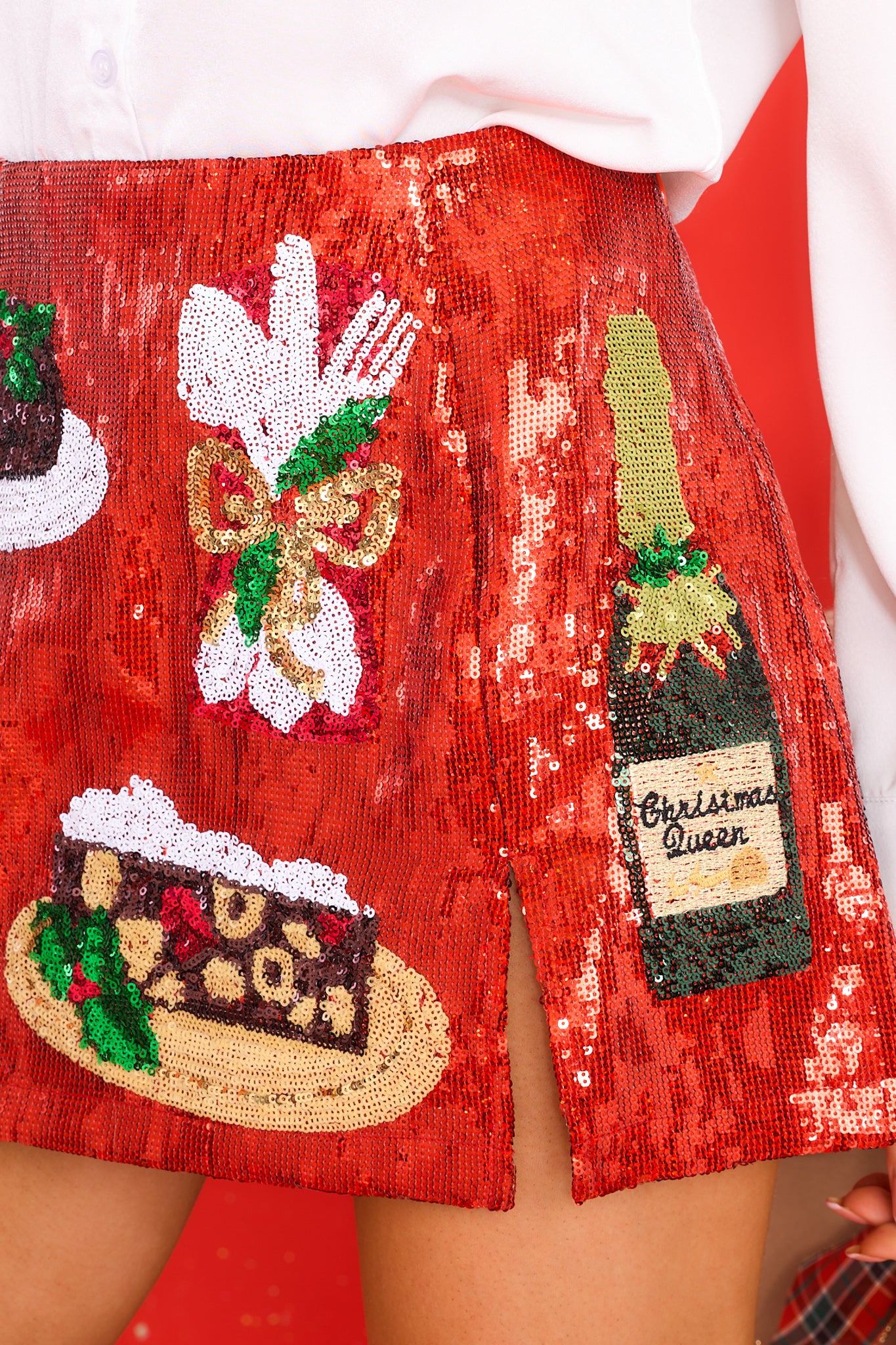 Make your holiday meals sparkle this season with our Red Sequin Christmas Food Skort! Crafted from dazzling sequins, it adds a special shine to your festive feast. This skort features a high waist design, a side zipper, shorts built into the lining, and sequins all throughout. Model is wearing an x-small. • 100% Polyester • Hand Wash Only • Lined • Imported