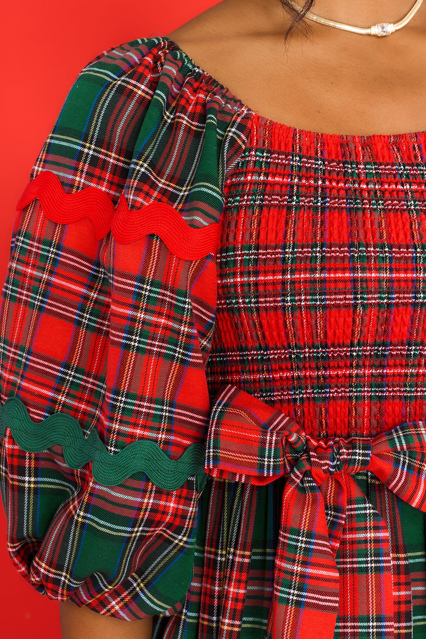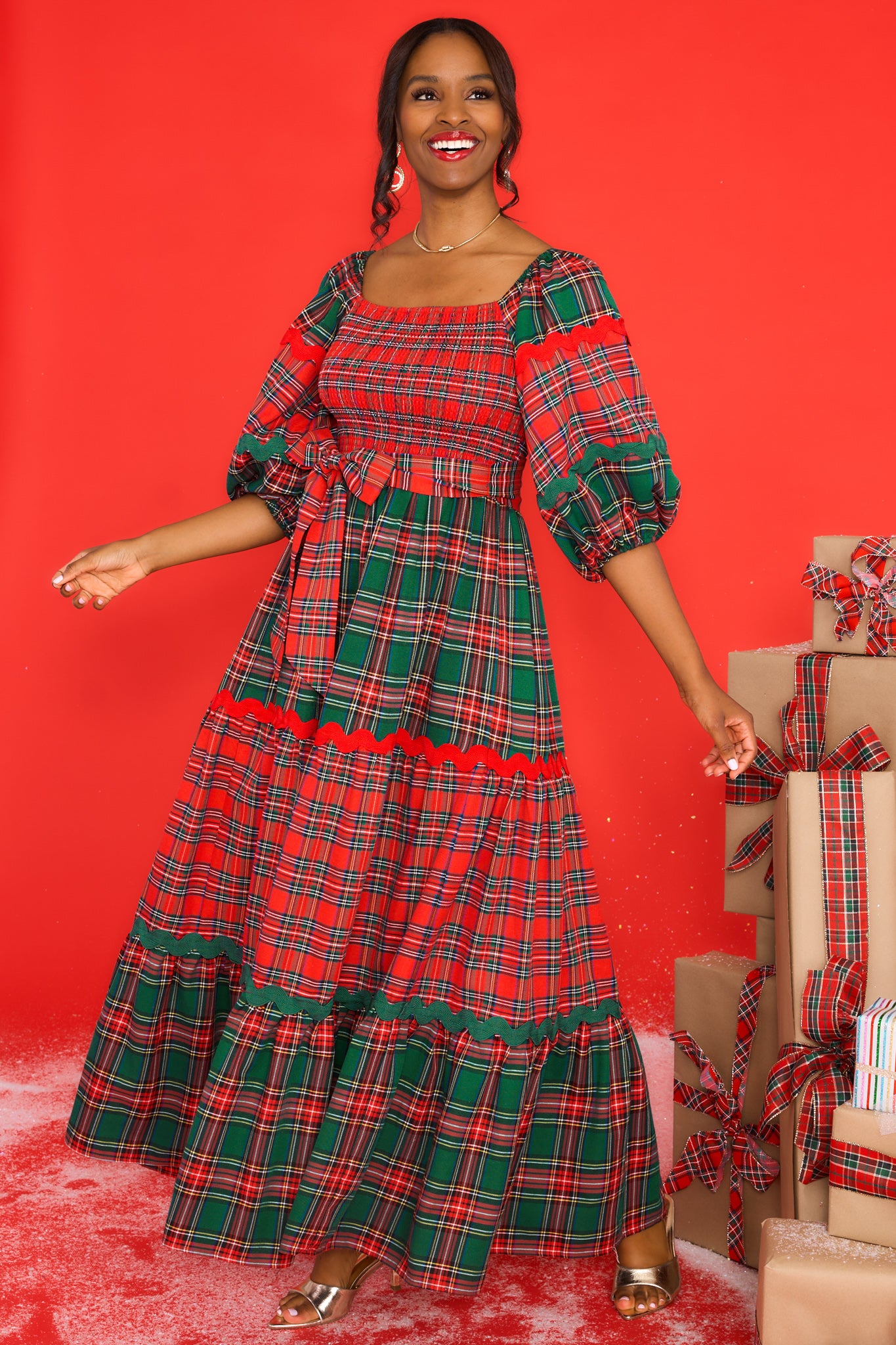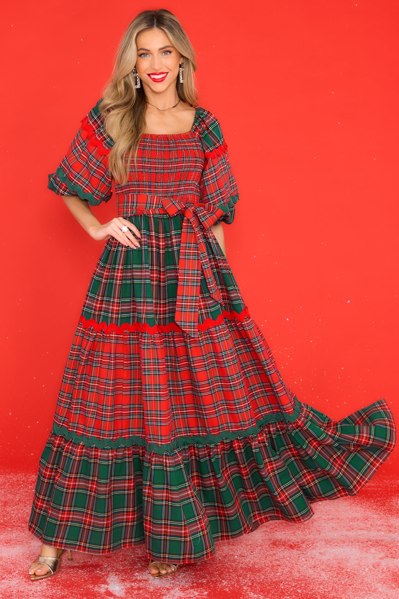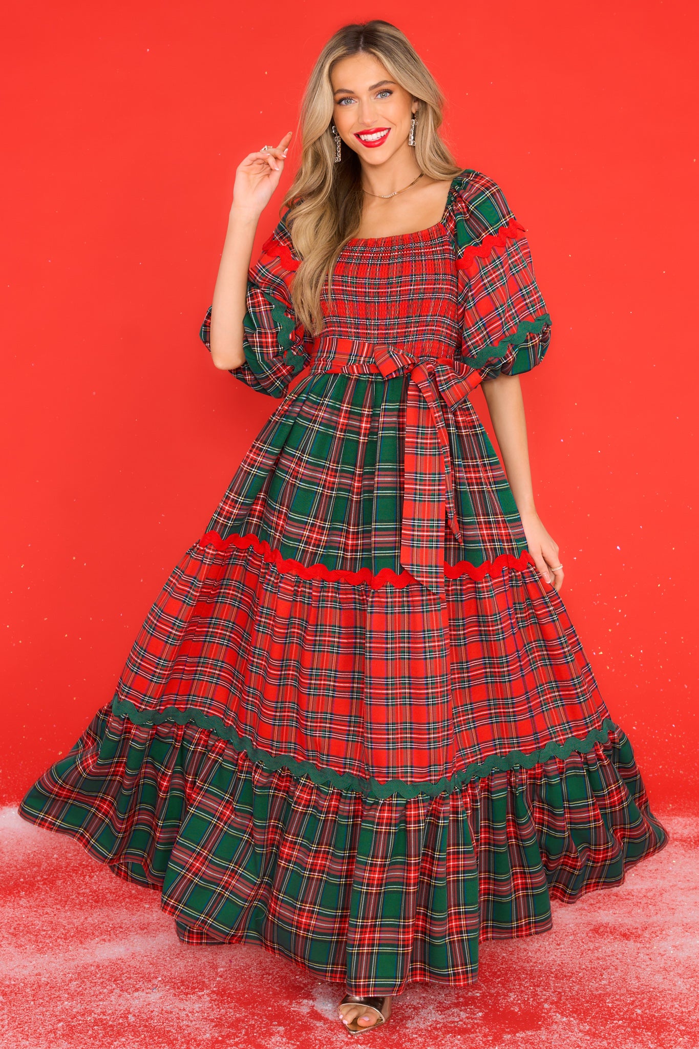 This Santa-approved dress is sure to make any holiday season merry and bright! Featuring a classic red plaid pattern, the Santa's Favorite Red Plaid Maxi Dress will have you feeling oh-so-darling all season long! This dress features a square neckline, puff sleeves with elastic cuffs, a fully smocked bust, a self-tie belt at the waist, and a long, exaggerated skirt with alternating plaid patterns. Model is wearing a small. • 80% Polyester, 20% Cotton • Hand Wash Cold • Unlined • Imported