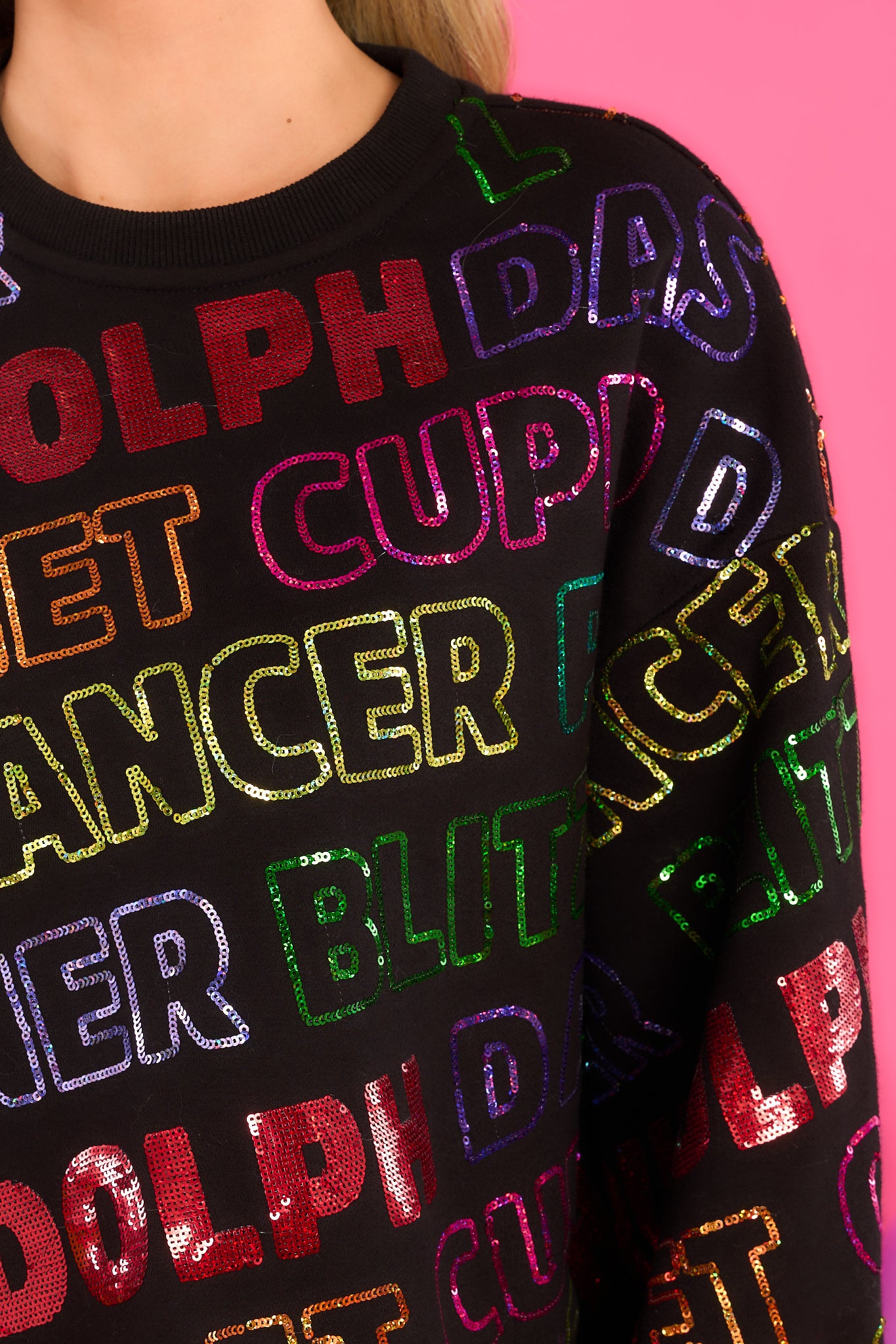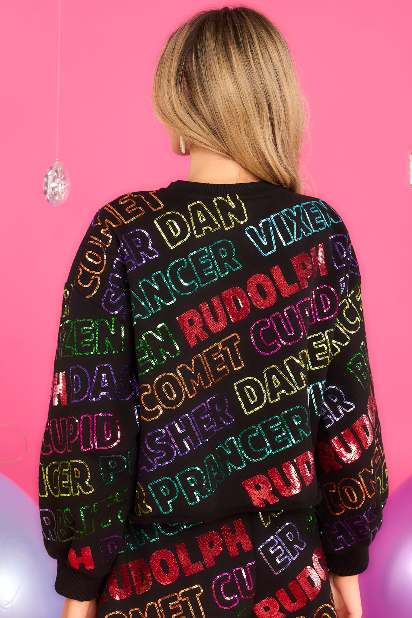 This Black Reindeer Name All Over Sweatshirt is the perfect way to show off your holiday spirit! Festive and cozy with a hint of sparkle from the sequins, you'll make Rudolph and the gang jealous! (And you don't even have to fly!) This sweatshirt features a crew neckline, sequin reindeer names, and long cuffed sleeves. Model is wearing an x-small. • 86% Cotton, 14% Polyester • Hand Wash Only • Unlined • Imported